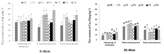 The soil Ca8-P content of the 0–20 cm surface soil was significantly lower than that in CK only in the treatment with fulvic acid (T1) in the wheat-harvest period. In the maize harvest period, the soil Ca8-P content was highest in the treatment with pig manure-vermicompost (T5), increasing by 23.1% compared with CK. The Ca8-P content of the soil in the 20–40 cm soil did not change much in the initial stage of fertilization, the wheat-harvest period and the maize-harvest period. Only the treatment with fulvic acid (T1) was lower than the other treatments in the wheat-harvest period. The other treatments showed a decreasing trend throughout the growing season.