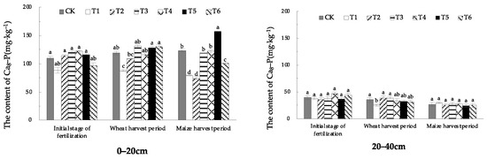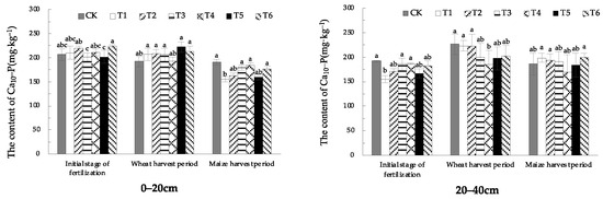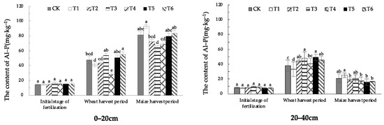 From different soil layers, the Al-P content in the 20–40 cm soil layer was significantly lower than that in the 0–20 cm layer during the maize-harvest period, with a lower degree of leaching downward.