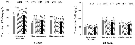 The distribution trend of Fe-P in different soil layers showed that the downward shift of leaching was significantly enhanced during the wheat-harvest period and the maize-harvest period compared to the initial stage of fertilization (Figure 8).