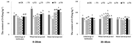 The content of soil O-P with different EOMs. The absence of identical letters within each treatment group across the graph signifies statistically significant differences between the groups (p < 0.05).