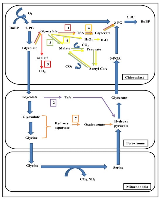 Various photorespiratory bypasses are designed in plants. Different colors indicate the photorespiratory bypass pathways (1–7). CBC—Calvin Benson Cycle; TSA—Tartronic Semialdehyde; 3-PG—Phosphoglycerate; RuBP—Ribulose-1,5- Bis Phosphate.