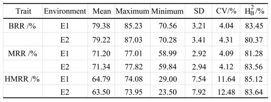 Phenotypic statistics of milling-quality-related traits in E1 and E2. H2B, broad-sense heritability; BRR, brown rice recovery; MRR, milled rice recovery; HMRR, head milled rice recovery.