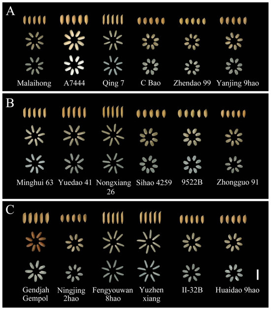 The harvested seeds were air-dried for three months and then used in the follow-up experiments. For each repetition, 100 g of seeds of each variety was selected and milled into brown rice using a machine (JLGJ4.5, Topp Yunnong Technology Co., Ltd., Hangzhou, China). Next, the brown rice was milled into the milled rice using a mini-type rice machine (JNMJ3, Topp Yunnong Technology Co., Ltd., Hangzhou, China). Then, the weights of the brown rice and milled rice of each variety were determined using an electronic balance. The head milled rice was selected from the milled rice and weighted using the electronic balance. We considered the rice to be the head milled rice when the rice length was more than 4/5 of the average length of all the rice. The BRR, MRR, and HMRR were calculated according to the following formulas: BRR (%) = the weight of brown rice (g)/the weight of rough rice (g) × 100, MRR (%) = the weight of milled rice (g)/the weight of rough rice (g) × 100, and HMRR (%) = the weight of head milled rice (g)/the weight of rough rice (g) × 100. Two repetitions were conducted for each trait’s measurement. The mean value of the two repetitions was calculated as the BRR, MRR, and HMRR percentages of each variety.