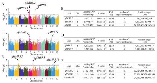 Identification of QTLs in rice via GWAS. (A) Manhattan plots for BRR in the whole population of rice accessions. (B) Information related to the identified QTLs for BRR. (C) Manhattan plots for MRR in the whole population of rice accessions. (D) Information related to the identified QTLs for MRR. (E) Manhattan plots for HMRR in the whole population of rice accessions. (F) Information related to the identified QTLs for HMRR. The Y axis shows negative log10-transformed p-values, and dots above the red line show the significant SNPs in the QTL region. The black arrows indicate the identified QTL. BRR, brown rice recovery; MRR, milled rice recovery; HMRR, head milled rice recovery; PVE, phenotypic variation explained.
