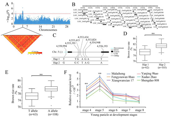Identification of the candidate genes for the QTL qBRR5.2 of BRR. (A) Manhattan plots for BRR on the chromosome 5 and the identification of the haplotype block of qBRR5.2. The Y axis shows negative log10-transformed p-values, and the dots above the red line show the significant SNPs in the QTL region. Pairwise LD was determined via the calculation of r2 (the square of the correlation coefficient between SNP states). (B) Identification of candidate genes in the region of qBRR5.2. (C) Haplotypes of LOC_Os05g08350 associated with BRR in rice. (D,E) Boxplots of BRR in accessions containing the different haplotypes (D) and elite alleles (E). (F) Expression analysis of the candidate gene LOC_Os05g08350 in different materials at different stages in young panicles. The relative expression values were normalized to the rice UBQ gene. Error bars indicate the standard deviation, and asterisks indicate significant differences determined using Student’s t-test (** p < 0.01).