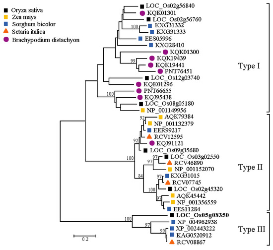 In the protein sequence encoded by LOC_Os05g08350, there is an F-box domain at the N-terminal. The SCF complex is an important E3 ubiquitin ligase. The F-box domain can interact with the subunit SKP1 of the SCF complex to achieve the specific degradation of different substrates [26]. In order to clarify the evolution of the F-box gene family in gramineous plants, the homologous proteins of the F-box gene family in five representative gramineous plants were further researched. The five representative gramineous plants were Oryza sativa, Zea mays, Sorghum bicolor, Setaria italica, and Brachypodium distachyon. The locus, chromosome, protein length, and protein-position information are listed in Table S5. The phylogenetic tree was constructed from 37 members of the gene families (Figure 5). The F-box gene family can be divided into three independent types in gramineous plants. Here, we refer to these three types as Type I, Type II, and Type III. There are 17 members in the Type I group, 15 in Type II, and 5 in Type III. In rice, there are four members in Type I, three in Type II, and one in Type III. The LOC_Os05g08350 protein in this study was a Type III protein.