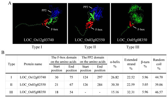 In order to further clarify the differences in the three types of F-box domains from the tertiary structure of the proteins, we carried out a modeling analysis on the Type I-LOC_Os12g03740, the Type II-LOC_Os03g02550, and the Type III-LOC_Os05g08350. The tertiary structures of the three types of F-box proteins are shown in Figure 6A. The Type I-LOC_Os12g03740 and Type II-LOC_Os03g02550 have not only F-box domains, but also PP2 domains (Figure 6A). The Type III-LOC_Os05g08350 contains only the F-box domain, and the protein structure is approximately divided into two parts, with a large space in the middle (Figure 6A). Meanwhile, there are significant difference in the α-helices and extended strands, but there are no differences in the β-turns and random coils among the three types (Figure 6B). These results provide an additional basis for the classification of F-box proteins in different types in rice.