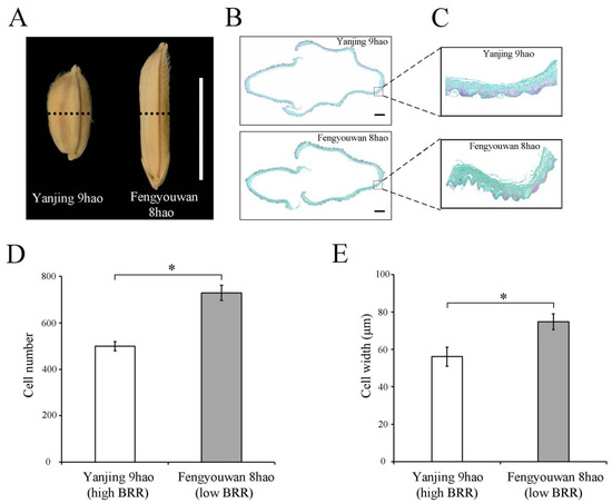 To determine whether the thickness of spikelet hulls affects BRR, we compared the cell numbers and cell widths in spikelet-hull cross sections of Yanjing 9hao with a high BRR value and Fengyouwan 8hao with a low BRR value. There were significant differences in the cell numbers and cell widths from the inner to outer parenchymal cell layers of the spikelet hulls between Yanjing 9hao and Fengyouwan 8hao (Figure 7). These findings suggest that the increase in the thickness of the spikelet hulls in Fengyouwan 8hao is due to an increase in the widths and numbers of cells in a cross-section in spikelet hulls.