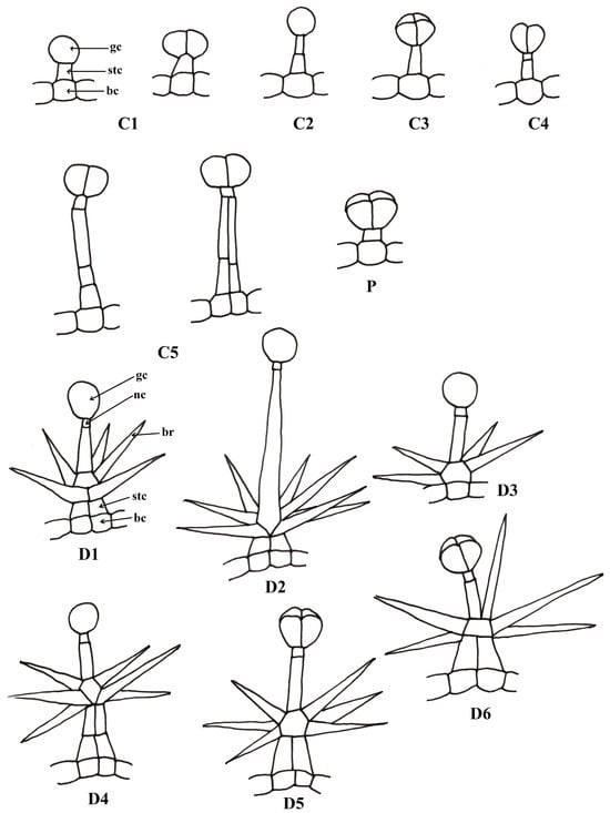 The data available in the literature regarding the morphology of glandular trichomes in the Phlomis species are synthesized in Table 1 and Figure 1. Considering the morphological characters described by various authors [13,39,42,43,44,45,46,47,48,49], we grouped the capitate trichomes into five categories (C1–C5) and the dendroid trichomes also into six categories (D1–D6). There is still variability in relation to these categories; the classification was made to simplify the description. In establishing the subtypes, the number of secretory cells, the relative size of the stalk, the number of component cells and the positioning and density of the branches (in the case of dendroid trichomes) were taken into consideration.