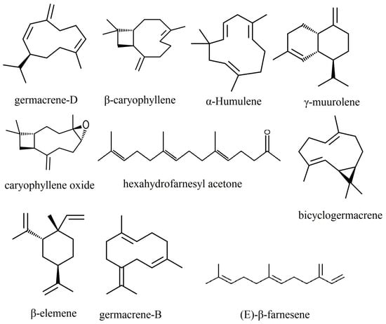 - Noge, K.; Becerra, J. Germacrene D, A Common Sesquiterpene in the Genus Bursera (Burseraceae). Molecules 2009, 14, 5289–5297. [Google Scholar] [CrossRef] [PubMed]