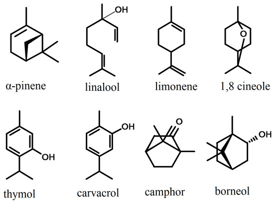 - Loza-Tavera, H. Monoterpenes in Essential Oils. In Chemicals via Higher Plant Bioengineering; Shahidi, F., Kolodziejczyk, P., Whitaker, J.R., Munguia, A.L., Fuller, G., Eds.; Advances in Experimental Medicine and Biology; Springer: Boston, MA, USA, 1999; Volume 464, pp. 49–62. ISBN 978-1-4613-7143-4. [Google Scholar]