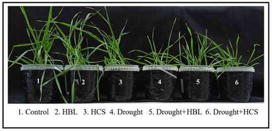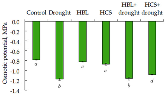 Effects of HBL, HCS, and drought on the osmotic potential of the cell contents of barley plant leaves. Values are given as the mean ± SD for each treatment. Values not sharing a common or same alphabet letter (a–d), and they differ significantly at p < 0.05 (Duncan’s multiple range test).