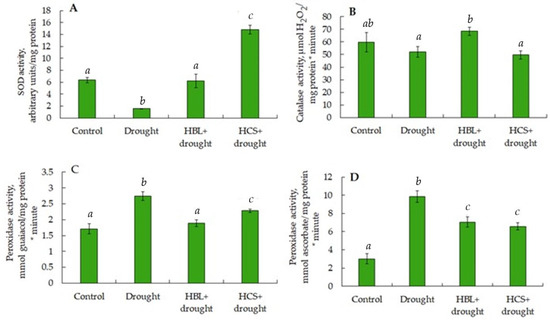 Effect of HBL, HCS, and drought on superoxide dismutase (A), catalase (B), guaiacol-dependent peroxidase (C), and ascorbate peroxidase (D) activities in leaves of barley plants. Values are given as the mean ± SD for each treatment. Values not sharing a common or same alphabet letter (a–c), and they differ significantly at p < 0.05 (Duncan’s multiple range test).