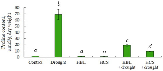 Effect of HBL, HCS, and drought on proline content in leaves of barley plants. Values are given as the mean ± SD for each treatment. Values not sharing a common or same alphabet letter (a–d), and they differ significantly at p < 0.05 (Duncan’s multiple range test).