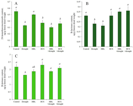 Content of 28-homobrassinosteroids (A), B-lactones (B), and B-ketones (C) in barley plants of “Biom” variety subjected to drought and/or exogenous treatment with 28-homobrassinosteroids. Values are given as the mean ± SD for each treatment. Values not sharing a common or same alphabet letter (a,b), and they differ significantly at p < 0.05 (Duncan’s multiple range test).