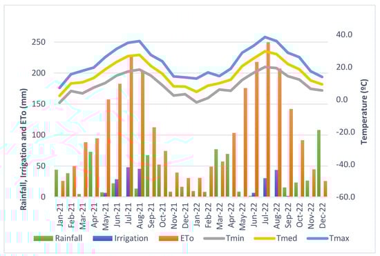 Monthly climatic variables during 2021 and 2022: rainfall, applied irrigation, reference evapotranspiration (ETo), average minimum temperature (Tmin), average temperature (Tmed) and average maximum temperature (Tmax). Data were obtained from the Magán public weather station (39°56′06.6″ N 3°56′32.4″ W).