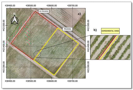 As in many other large-scale vineyards, this one is divided into smaller units for management purposes, designated as plots or parcels. Our study was executed in one of these plots (Figure 2), belonging to a zone classified as a coarse-loamy, gypsic, mesic Typic Calcixerepts soil [34]. In this 5 ha plot, two pruning strategies have been traditionally used, dividing it into two 2.5 ha areas with homogeneous conditions and management except for pruning. To a large extent, vineyard managers have done so over the last few years to assess its impact on qualitative performance. From this, two pruning treatments were selected for this study. The pruning treatment was developed over 10 years ago. The activity takes place in winter, around the second week of February. This plot area has a more intensive pruning approach. Firstly, mechanical pruning is performed with a horizontal trimmer 30 cm above the cordons to eliminate large amounts of wood in the most cost-effective way. Then, the vines are spur-pruned by hand, leaving approximately two buds per node. The no pruning treatment was developed over 10 years ago. Like the rest of the plots, the activity takes place in winter, around the second week of February. This treatment area was minimally hand-pruned, focusing on removing damaged or unnecessary parts. Therefore, the pruning magnitude is substantially smaller, considering the amount of wood removed after each productive campaign. Six vines out of each pruning system in adjacent lines were selected in order to take the different experimental measurements (Figure 2b).