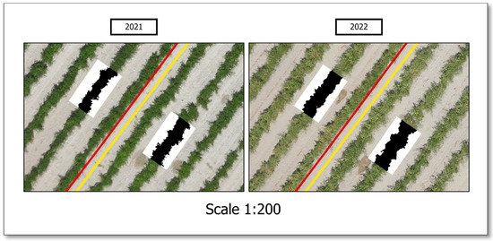 The canopy soil coverage was calculated from a high-resolution (3 cm/pixel) RGB image using QGIS software (version 3.22.13 Białowieża) at the beginning of the irrigation season: 1 July 2021 and 30 June 2022. At this moment, the vegetative development stopped. The apex stops growing and does not develop more leaves (QGIS, Free Software Foundation, Boston, MA, USA). A non-supervised k-means classification with two classes was run to differentiate the vine canopy and soil pixels for a posterior percentage of covered soil calculation (Figure 3).