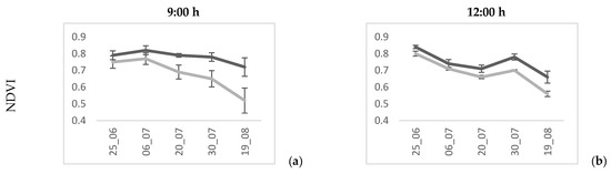 Figure 5 shows the NDVI performance between the treatments at two time (9:00 and 12:00) for the last flight date of the 2021 season (19 August). It is observed that the pruning treatment exhibits higher values of the NDVI than the non-pruning treatment at both times of day.