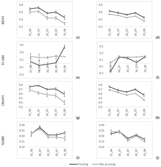 The NDVI showed no differences in the first two measurement days at 9:00 (Figure 4a). The RDVI and OSAVI showed statistical differences between the treatments for all the dates and times in 2021(refer to Appendix A Table A1 and Table A2). The evolution of the RDVI was constantly equidistant between the two treatments throughout the season at both times (Figure 4c,d). The NDRE did not exhibit a clear difference throughout the season between the two treatments (Figure 4i,j). The differences between the pruning treatments only showed statistical differences for the 9:00 flights in both campaigns (Table 7).