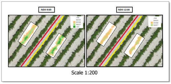 Details of the NDVI of two pruning treatments at two times of day. Left imagen corresponding to values of the NDVI at 9:00. Right imagen corresponding to values of the NDVI at 12:00. The no pruning treatment is located near the red line; the pruning treatment is located near the yellow line.