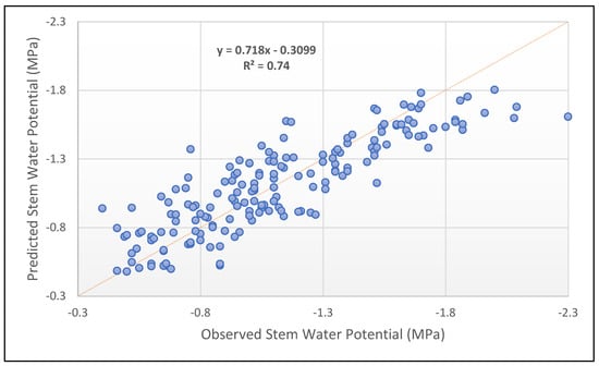 The results of the calculated R2 values for the simple linear regressions are depicted in Table 8. Different approaches were developed concerning the data included in the models. Seven different single-variable regression models were performed for each VI value and band reflection (four single-season and single-time, two multi-seasonal and single-time, and one multi-seasonal and multi-time). Even though our objective in this work was to develop a multi-seasonal robust model, the Ψstem was also predicted for individual seasons and flying times to better understand the results.