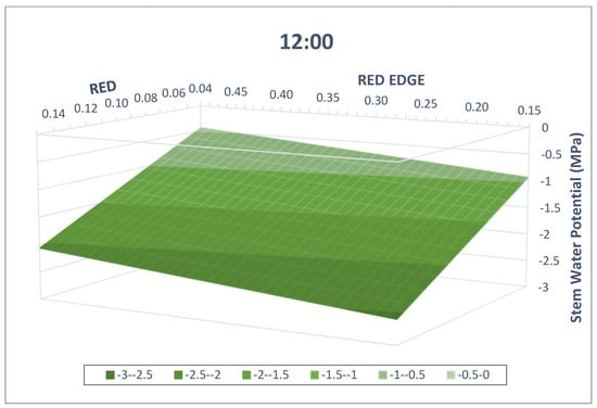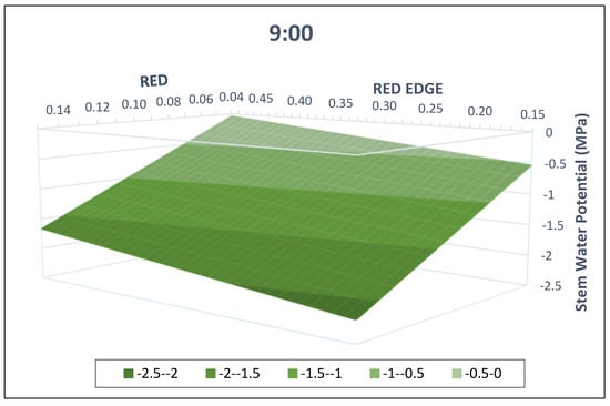 In order to estimate the Ψstem from the UAV-acquired multispectral information, different model approaches were evaluated using Statgraphics 19 software (Statgraphics Technologies, Inc. The Plains, Virginia, USA). Simple linear regressions between the Ψstem and all individual bands (green, red, red edge and NIR) and simple linear regressions between the Ψstem and Vis (NDVI, RDVI, TCARI, OSAVI and NDRE) were performed.