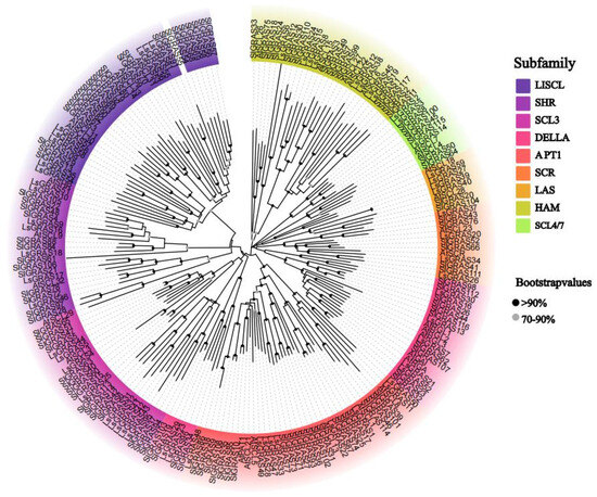 The GRAS proteins have been widely studied over the past decade [16,17]. These proteins consist of 400–770 amino acid residues and can be divided into variable amino (N-) terminal regions and highly conserved carboxyl (C-) terminal regions [18,19]. The N-terminus comprises chaotic domains involved in molecular recognition, exhibiting a high degree of variability. The GRAS domain is mainly composed of five motifs at the carboxyl (C-) terminal, leucine-rich region I, VHIID, leucine-rich region II, PFYRE, and SAW [19,20]. Notably, these five motifs play important roles in GRAS’s interactions with other proteins [21]. Because of this, the GRAS proteins are widely involved in many key processes of signal transduction, root radial elongation, axillary meristem formation, and stress response [22,23]. To date, GRAS gene families have been identified and analyzed in more than 30 monocotyledons and dicotyledons, including wheat and rose [24,25]. Previously, the Arabidopsis GRAS gene family was categorized into eight subfamilies, namely DELLA, SCL3, LAS, SCR, SHR, HAM, LISCL, and PAT1, based on conserved domains and functions [26,27]. The DELLA family contains the GAI, RGA, and RGL genes, which serve as major inhibitors of gibberellin signal transduction [28]. The SCL3 protein has been verified as a switch that mediates root elongation [29]. It has been reported that the LAS protein is closely related to lateral bud formation in the vegetative growth stage of Arabidopsis [30]. Additionally, during plant root growth, the SHR and SCR proteins tend to form SCR/SHR complexes [31]. Research indicates that in shoot apical meristem tissues, a group of key regulatory factors known as the Hairy Meristem (HAM) family GRAS domain proteins play a crucial role in determining the initiation and proliferation of shoot stem cells [32]. Moreover, the overexpression of VaPAT1 (a GRAS gene of Vitis amurensis) improved the abiotic stress tolerance of transgenic Arabidopsis [33]. With the rapid development of sequencing technology, several new families, such as DLT, SCL4/7, Os19, Os4, and PT20, have gradually enriched the original GRAS genes subfamily [34].