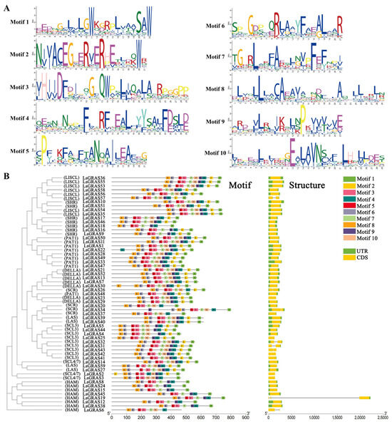 Phylogenetic clustering and gene structure of LsGRAS members. (A) Ten motif patterns of LsGRAS members are described. (B) On the left, the motif distribution of LsGRAS members is represented. Right: The green boxes represent the untranslated 5′ and 3′ regions, the yellow boxes represent exons, and the black lines represent introns.