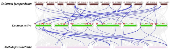 Using genomic information sourced from Phytozome, the analysis determined the distribution of LsGRAS genes across each chromosome. Concurrently, the study examined the repetitive patterns of the LsGRAS genes, generating a repetition map to unveil gene duplication events within the lettuce genome. To explore the synergistic relationship between the homologous LsGRAS genes in lettuce and those in other species, we downloaded genomic data and the gene annotation files of Arabidopsis (TAIR annotation release 10) and Solanum lycopersicum (V1.1). The TBtools software was employed to create and construct synchronous analysis diagrams [51,52].