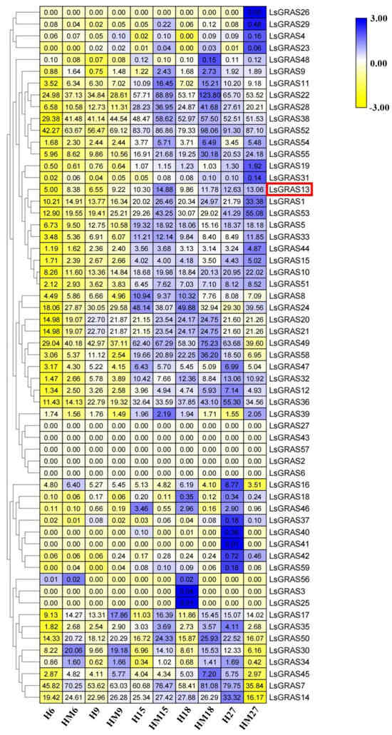 To investigate the expression profiles of the 59 LsGRAS members in lettuce under high-temperature treatment, we conducted RNA-Seq analysis using publicly available leaf transcriptome data from NCBI (Bio project PRJNA810911). The results indicate that the expression levels of the GRAS genes in lettuce treated with exogenous melatonin at different time points were higher than those in treatments without exogenous melatonin under high-temperature conditions. This suggests that members of the GRAS family may play an essential role in melatonin-mediated heat stress resistance (Figure 5). The results reveal that the expression level of the LsGRAS13 gene after high-temperature melatonin treatment (HM) was higher than that after without exogenous melatonin treatment (H) on days 6, 9, 15, 18, and 27. The expression trend showed a strong correlation with the growth and development of lettuce, peaking on day 15, followed by a gradual decline in growth. Additionally, the expression of LsGRAS52 was the highest. Five LsGRAS genes were not expressed (LsGRAS2, LsGRAS6, LsGRAS26, LsGRAS27, LsGRAS43, LsGRAS57). Therefore, the change in the expression level of the LsGRAS13 gene is proportional to the growth time, providing a more reliable reference for studying lettuce bolting compared to other irregular changes in genes.