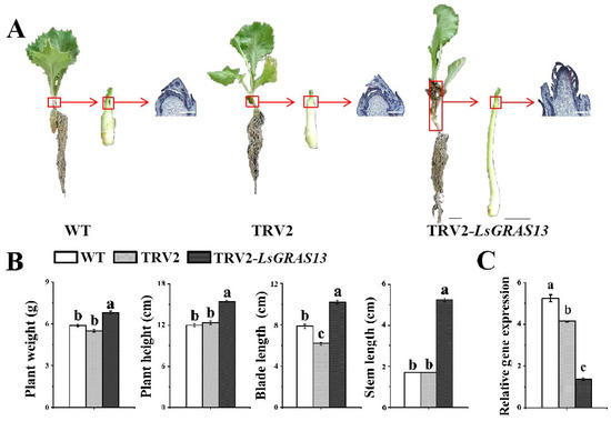 Phenotype of the LsGRAS13 gene-silenced lettuce plants. (A) The bolting phenotype developed seven days after TRV2-LsGRAS13 infection; scale bars = 1 cm. The paraffin section phenotype is also shown; scale bars = 100 μm. (B) The plant weight, plant height, blade length, and stem length of lettuce with TRV2-LsGRAS13 treatments. (C) Utilizing the qRT-PCR method, we detected the relative expression levels of the LsGRAS13 gene in lettuce plants. One-way analysis of variance (ANOVA) followed by Tukey’s multiple ange test was used to determine the values with significant variation (p < 0.05), which are indicated by different letters placed above the bars.