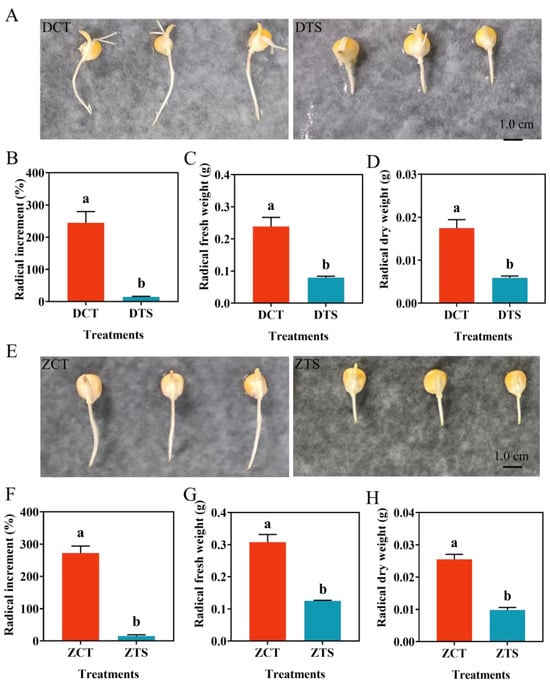 Phenotypic changes induced by low temperatures on radicle growth in maize seeds. (A,E) are observations and photographs of DMY1 and ZD958 germinated seeds after 48 h of incubation under CT or TS conditions, respectively; (B,F) represent the percentage of radicle length of germinated seeds of the two varieties determined after 48 h of incubation under CT or TS conditions, respectively; (C,G) are measurements of the fresh radicle weight of the germinated seeds of the two varieties after 48 h of incubation under CT or TS conditions, respectively; (D,H) are measurements of the dry radicle weight of the germinated seeds of the two varieties after 48 h of incubation under CT or TS conditions, respectively. CT: control treatment; DCT: control treatment of DMY1; DTS: low-temperature treatment of DMY1; TS: low-temperature stress; ZCT: control treatment of ZD958; ZTS: low-temperature treatment of ZD958. Data represent the mean ± standard error of four replicates. Means with different letters indicate significant differences between the different treatments (p < 0.05, Duncan’s multiple range test).