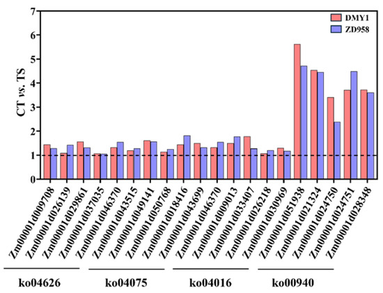 Five DEGs were randomly selected from each of the four metabolic pathways, plant–pathogen interaction (ko04626), plant hormone signal transduction (ko04075), MAPK signaling pathway–plant (ko04016), and phenylpropanoid biosynthesis (ko00940), and analysed (Figure 5). The |log2FC| values of the 20 selected DEGs were all >1, indicating that all 20 genes underwent significant expression changes at the transcriptional level under TS conditions. Among them, the phenylpropanoid biosynthesis pathway showed higher fold expression of DEGs, revealing the phenylpropanoid biosynthesis pathway as a potential candidate pathway for maize radicles to respond to TS.