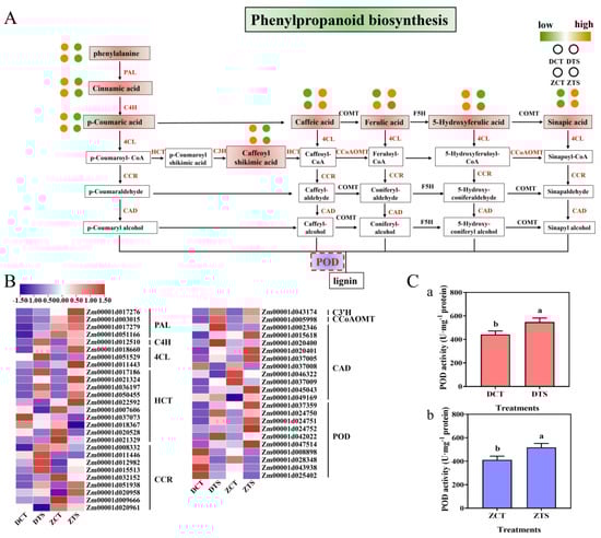 Analysis of phenylpropanoid biosynthesis pathways and determination of peroxidase (POD) enzyme activity in maize radicles of DMY1 and ZD958 under TS. (A) Metabolic changes in DMY1 and ZD958 under TS. (B) Transcriptional changes in DMY1 and ZD958 genes under TS. (C) Changes in POD activity in the radicles of DMY1 (a) and ZD958 (b) germinated seeds after incubation under CT or TS conditions for 48 h, respectively. DCT: control treatment of DMY1; DTS: low-temperature treatment of DMY1; ZCT: control treatment of ZD958; ZTS: low-temperature treatment of ZD958.