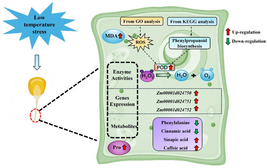 Comparing DEGs in phenylpropanoid biosynthesis pathways to the Arabidopsis thaliana genome matched 49 A. thaliana homologs (Table S7). Some of these 49 A. thaliana genes participate in the cold response, and nearly half of them are involved in the oxidative stress response, according to a previous report (Figure 7, Table S7). Further explanation suggests that approximately 60% of the DEGs found in this study are related to cold tolerance in the phenylpropanoid biosynthesis pathway. Among them, genes AT1G05260 (Zm00001d024750, Zm00001d024751, and Zm00001d024752) and a homologous A. thaliana gene encoding POD-related genes are involved in cold response and oxidative stress response [48,49]. They may be important candidate genes for promoting low-temperature resistance in maize radicles at the germination stage. This suggests that POD may be an important indicator for assessing cold tolerance in maize during germination.