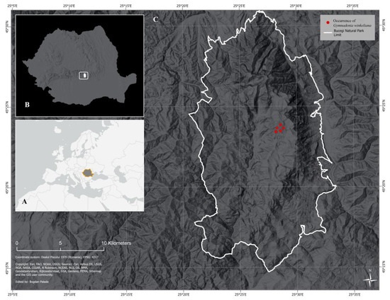 Geographical distribution of Gymnadenia winkeliana N.Anghelescu, L.Balogh, M.Balogh & N.Kigyossy. (A) Map of Europe, North Africa, the Middle East and Asia; Romania (dark-grey coloured). (B) Map of Romania. (C) Map of Bucegi Natural Park (BNP) ROSCI001, Southern Carpathians, Central Romania. Known locations of the type specimens (holotype) Gymnadenia winkeliana, with an extent of area of occupancy (AOO) of 2.5–5 km2 (red dots). Map created by Bogdan Palade [8].