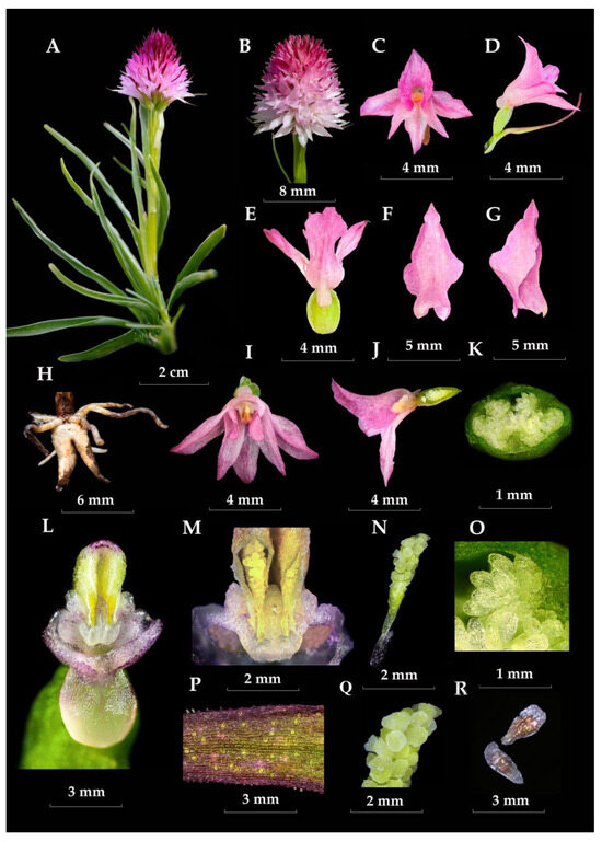Lankester Composite Dissection Plate (LCDP) of Gymnadenia winkeliana N.Anghelescu, L.Balogh, M.Balogh & N.Kigyossy. (A) Habitus and leaves. (B) Inflorescence exhibiting the characteristic gradient (dégradé) of pink hues. (C) Flower—frontal view. (D) Bract-ovary-flower unit—side view. (E) Ovary-flower unit—above view; swollen ovary indicates apomixis. (F) Labellum—abaxial/lower surface view. (G) Labellum—adaxial/upper surface view. (H) Root tubers (deeply digitate) and adventitious roots formed on a very short rhizome. (I) Perianth segments and gynostemium (labellum missing)—frontal view. (J) Flower-ovary unit—transversal section side view. (K) Ovary—transversal section. (L) Gynostemium and spur—frontal view. (M) Anther—frontal view (pollinia placed inside the dehiscent anther). (N) Massulate pollinarium—pollinia, caudicle and viscidium unit. (O) Ovules. (P) Bract and anomocytic stomata—upper surface. (Q) Massulae—detail. (R) Seeds—detail. Illustration and photos by Nora E. Anghelescu from the holotype, 5 July 2023 BNP, Romania.