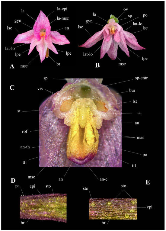 Gymnadenia winkeliana N.Anghelescu, L.Balogh, M.Balogh & N.Kigyossy flower structure, and flower section (the labellum was removed) showing the reproductive organs (gynostemium) in the upper, deep-pink flowers. (A) Flower—frontal view of the perianth segments and bract; flowers are non-resupinate, and the labellum (epichile) is oriented upwards; labelar lateral lobes form a tunnel (mesochile), which leads to the gynostemium/anther (facing downwards). (B) Transversal section of the flower (labellum removed); one pollinarium protrudes off the anther; the spur is short and saccate. (C) Gymostemium—detail in its downward (natural) position; stigmatic lateral lobes spread sideways, forming a prominent/protruding rostellar flap; thecae are dehiscent and pollinia are freed from thecae flaps; viscidia are partially contained in a rudimentary, membranous bursicle; the anther connective is purple-pigmented. (D,E) Bract detail—upper surface presenting anomocytic stomata. Abbreviations: an-c—anther connective; an-th—anther theca; an—anther; au—auricle; br—bract; bur—bursicle; ca—caudicle; epi—epichile; epd—epidermis; gyn—gynostemium; la-msc—labellum mesochile; la—labellum; lat-lo—lateral labellar lobe; lpe—lateral petal; lse—lateral sepal; lsl—lateral stigmatic lobe; mas—massula/massulae; mse—median sepal; po—pollinia; rof—rostellar flap; ros—rostellum; sp-entr—spur entrance; sp—spur; st—stigma; sto—stomata; tfl—thecal flaps; vis—viscidium. Illustration and photos by Nora E. Anghelescu from the holotype, 5 July 2023 BNP, Ro.