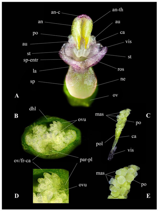 Gymnadenia winkeliana N.Anghelescu, L.Balogh, M.Balogh & N.Kigyossy gynostemium-spur unit detail, ovary section and pollinarium structure (section of the young, basal, whitish-pink flowers) (A) Gynostemium-spur unit detail in basal (whitish) flowers; purple pigmentation is reduced, showing a reduced concentration of anthocyanins; viscidia are completely enclosed within the rudimentary bursicles; the spur is roundish-spherical, nectar secreting. (B) Ovary—transversal section showing parietal placentation; developing ovules are reaching the immature seed stage, showing an already reticulated testa. (C) Pollinarium—massulate pollinia-caudicle-viscidium unit; massulae are loosely forming the pollinia; free viscidial discs are translucent and well-developed. (D) Ovules—detail of the reticulated testa in ovaries of young, basal flowers. (E) Massulae—details. Abbreviations: an-c—anther connective; an-th—anther theca; an—anther; au—auricle; bur—bursicle; ca—caudicle; dhl—dehiscence lines; fr—fruit; mas—massula/massulae; ne—nectar; ov—ovary; ov/fr-ca—ovary/fruit capsule; ovu—ovule; pa-pl—parietal placentation; po—pollinia; pol—pollinarium; ros—rostellum; sp-entr—spur entrance; sp—spur; st—stigma; vis—viscidium. Illustration and photos by Nora E. Anghelescu from the holotype, 5 July 2023 BNP, Romania.