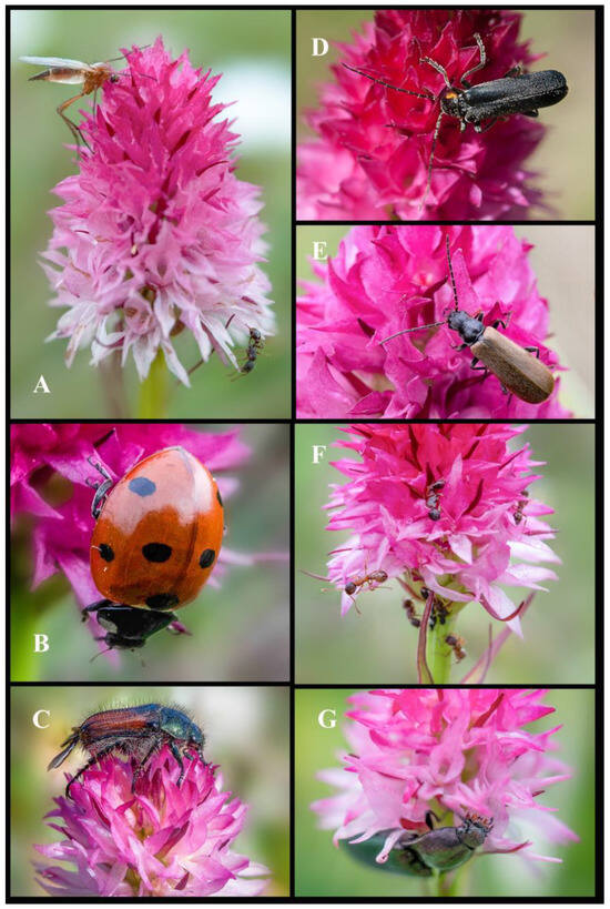 Gymnadenia winkeliana N.Anghelescu, L.Balogh, M.Balogh & N.Kigyossy—Coleopteran, Dipteran and Hymenopteran pollinators and visitors. (A) Empis trigramma (Empididae Latreille, 1804), yellow dance fly, potential true pollinator. (B) Coccinella septempunctata (Coccinellidae Latreille, 1807), seven-spot ladybird, visitor, carnivorous and feeding on aphids. (C) Phyllopertha horticola (Scarabaeidae Latreille, 1802), garden chafer, garden foliage beetle, visitor, phytophagous. (D) Cantharis obscura (Cantharidae Imhoff, 1856), soldier beetle, potential/accidental pollinator, visitor, pollen forager. (E) Rhagonycha lignose (Cantharidae Imhoff, 1856), golden soldier beetle, visitor, pollen forager. (F) Myrmica rubra (Formicidae Latreille, 1809), common red ant, European fire ant, accidental pollinator, visitor, carnivorous. (G) Ctenicera cuprea (Elateridae Leach, 1815), common click beetle, accidental pollinator, visitor, phytophagous. Illustration and photos by Nora E. Anghelescu, June–July 2017–2023 Bucegi Natural Park (BNP), Romania.