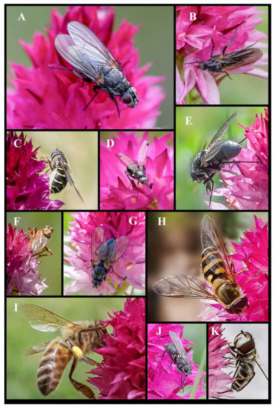 Gymnadenia winkeliana N.Anghelescu, L.Balogh, M.Balogh & N.Kigyossy—Dipteran pollinators and visitors. (A) Adia cinerella (Anthomyiidae Robineau-Desvoidy, 1830), flower fly, potential/accidental pollinator. (B) Empis ciliata (Empididae Latreille, 1804), black dance fly, true pollinator. (C) Syrphus ribesii (Syrphidae Latreille, 1802), common hoverfly, accidental pollinator. (D) Sepsis fulgens (Sepsidae Walker, 1833), lesser dung fly. (E) Calliphora (cf.) (Calliphoridae Brauer & Bergenstamm, 1889), blow fly, accidental pollinator. (F) Scathophaga stercoraria (Scathophagidae Robineau-Desvoidy), yellow dung fly, accidental pollinator, visitor. (G) Hydrotaea sp. (Muscidae Latreille, 1802), house fly, dump fly, accidental pollinator. (H) Syrphus ribesii (Syrphidae Latreille, 1802), common hoverfly, accidental/potential pollinator. (I) Apis mellifera (Apidae Latreille, 1802), European honey bee, true pollinator. (J) Pegomya sp. (Anthomyiidae Robineau-Desvoidy, 1830), beet leafminer, accidental pollinator. (K) Scaeva pyrastri (Syrphidae Latreille, 1802), Pied hoverfly, accidental pollinator. Illustration and photos by Nora E. Anghelescu, June–July 2017–2023 Bucegi Natural Park (BNP), Romania.