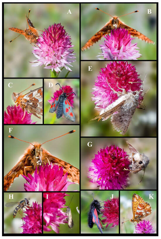 Gymnadenia winkeliana N.Anghelescu, L.Balogh, M.Balogh & N.Kigyossy—Lepidopteran and Dipteran pollinators and visitors. (A–C,F,K) Boloria pales (Nymphalidae Rafinesque, 1815), shepherd’s fritillary true pollinator. (D) Zygaena exulans (Zygaenidae Latreille, 1809), Scotch burnet true pollinator. (E,G) Pharmacis carna (Hepialidae Stephens, 1829), ghost moths, furry moth true pollinator. (H) Eupeodes corollae (Syrphidae Latreille, 1802), common hoverfly, accidental/potential pollinator. (I) Adela sp. (Adelidae Bruand, 1851), fairy moths, potential pollinator. (J) Zygaena loti (Zygaenidae Latreille, 1809), slender Scotch burnet true pollinator. Illustration and photos by Nora E. Anghelescu, June—July 2017—2023 BNP, Romania.