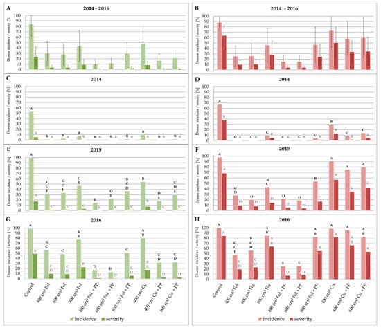 Potassium phosphonates improved the effect of contact fungicides against grapevine downy mildew (GDM). Graphs show the disease incidence and severity of P. viticola in leaves and berries of V. vinifera cv. Mueller–Thurgau after the application of different fungicides in the years 2014 (C,D), 2015 (E,F), and 2016 (G,H). Green bars show results for leaves, red bars for berries. Different letters indicate significant differences between the treatments while black letters refer to disease incidence and grey letters to disease severity (one-way ANOVA; p ≤ 0.05). (A,B) show average values from all three years which were subject to large variability and therefore show no significant differences between the treatments. Cu = Cuprozin progress®, Fol = Folpan®, PP = potassium phosphonates.