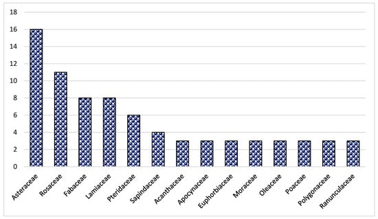 In the present study, 144 species from 70 families and 128 genera were found (Table 2). Asteraceae was the dominant family (16 species), followed by Rosaceae (11 species), Lamiaceae (8 species) and Fabaceae (8 species) (Figure 1). The dominance of these families in the study area could be due to the suitability of the habitat and environment for the members of these families. Similar results were reported in Brazil, Ethiopia and India [47,51,62,63,64]. The frequent use of these families could also be due to easy access, knowledge of long-term use and high content of bioactive constituents. Most of the herbal preparations in the study area were based on herbaceous species followed by shrubs and trees (Figure 2). The probable reason for this is the abundant growth and easy availability of herbaceous species, while the lesser number of trees could be due to climatic and environmental factors such as altitude, etc. These findings are in line with other studies from Pakistan [65,66,67,68,69,70,71]. Indeed, land use practices such as deforestation and the conversion of natural habitats to intensive agriculture can contribute significantly to genetic erosion, especially in regions such as Pakistan. These factors can lead to a loss of biodiversity, both in herbaceous and tree species, affecting the availability and abundance of medicinal plants. In addition, changing land use patterns can disrupt ecosystems and affect the distribution and survival of plant species. Therefore, although altitude and other environmental factors play a role, it is important to consider the broader effects of land use change on genetic erosion and the diversity of medicinal plants in the region.