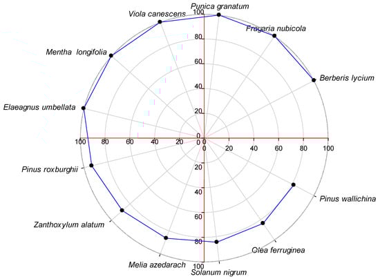 The Fidelity Level (FL) of the 69 most important plant species ranged from 12.5% to 100%. A high FL value generally indicates the dominance of a particular ailment in a region and the use of the same species to treat it [46,109]. The species with an FL value of 100 were Berberis lycium, Fragaria nubicola, Punica granatum, Viola canescens, Mentha longifolia and Elaeagnus umbellata, which were used for wound healing, mouth infections, jaundice, fever, stomach ailments and toothache (Figure 7). Plant species with a high FL are considered ideal for ethnopharmacological studies [110]. However, plants with a low FL should not be underestimated [111].