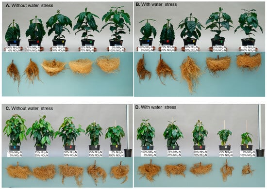 As was reported by Carr et al. [47], the differences in growth and nutrient absorption displayed by the coffee plants in the greenhouse trials were directly correlated with the influence of the N forms, and varying the NH4-N/NO3−N ratios directly affected the charge balance of young coffee plants. A higher content of NH4-N in the nutrient solution increases the NH4+ content in the soil, with a stronger effect under water-stress conditions directly affecting the nutrient uptake. Excessive NH4+ feeding results in excessive acidification of the growth medium or nutrient solution, nutrient imbalance, and impaired plant growth.