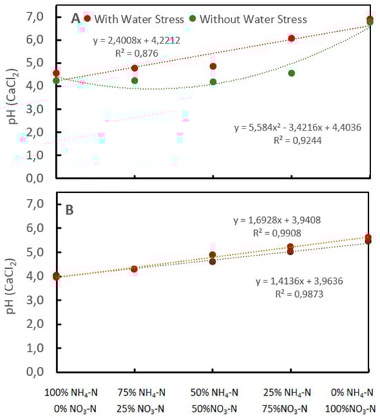 The soil pH significantly changes when different nitrogen forms and water levels are present. In Trials 2 and 3, where sand and soil were used as the growth medium, soil pH increased as the proportion of nitrogen in the NO3-N form in the nutritional solution increased. In Trial 2, where sand was used as the growth medium, without water stress, the pH of the soil increased at a rate of 0.024 units per percent of nitrogen in the NO3-N form, while in the water-stressed treatment, the soil pH showed a significant increase only in the treatments with 25% to 0% NH4-N/75 to 100% NO3-N (Figure 2A).