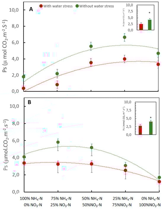 When coffee plants were grown in quartz sand, without water-stress conditions, the mean Ps was 6.63 μmol CO2 m−2 s−1 in the treatment with 25% NH4-N/75% NO3-N, while under conditions of water stress, the highest Ps values were observed in the treatments with 50 to 25% NH4-N and 50% to 75% NO3-N, being 3.55 and 3.97 μmol CO2 m−2 s−1, respectively. Treatments with 100% NH4-N/0% NO3-N with and without water stress provided the lowest Ps, with mean rates of 0.40 and 1.81 μmol CO2 m−2 s−1, respectively (Figure 3A).