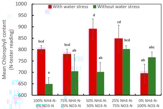 Influence of the water level and N forms on the chlorophyll content in mature coffee leaves in coffee plants growing in soil (greenhouse trial 3). Different letters denote statistically significant differences according to Fisher’s LSD test alpha = 0.05.